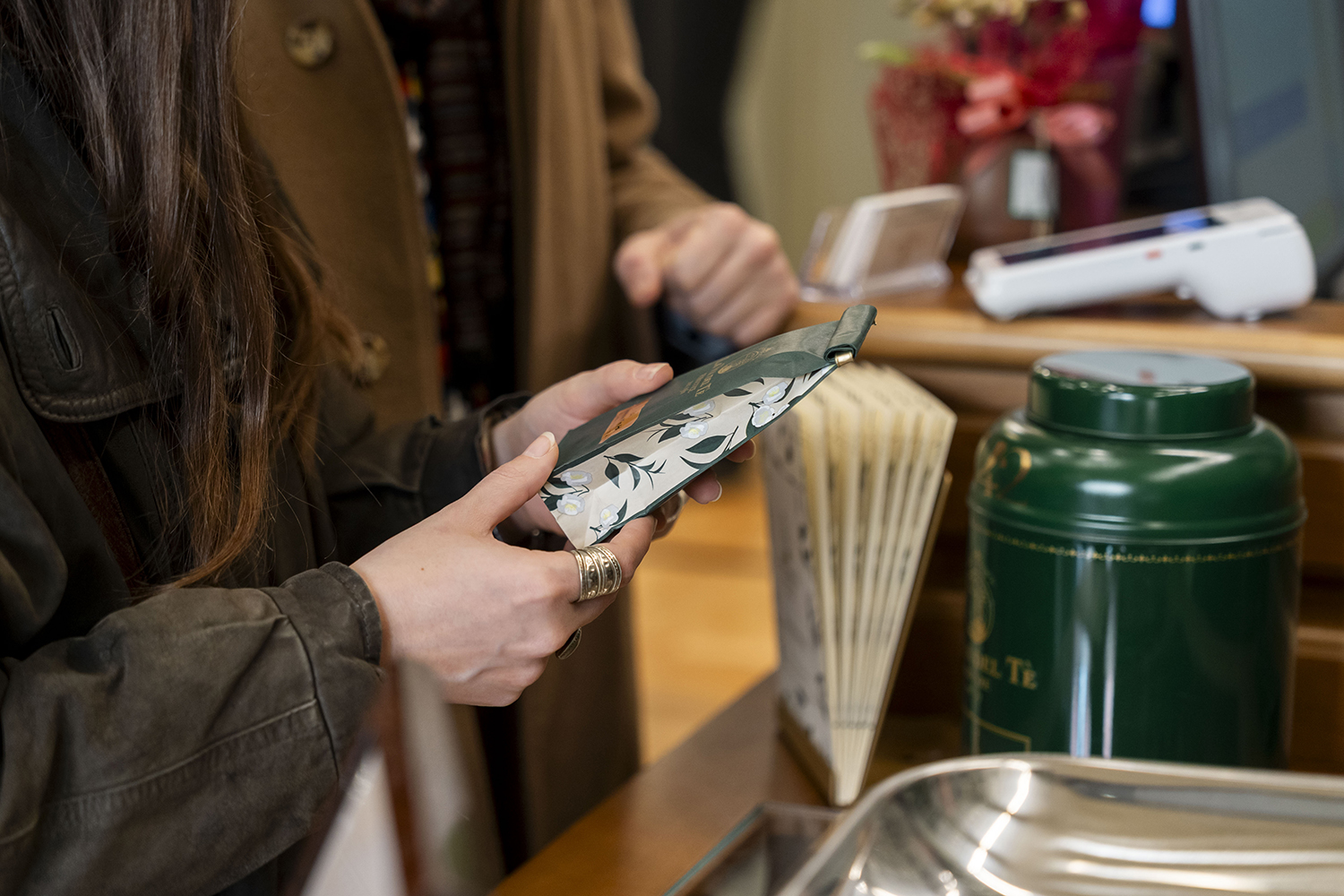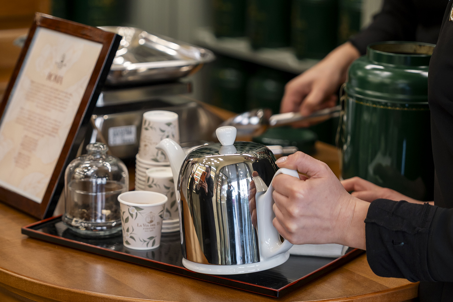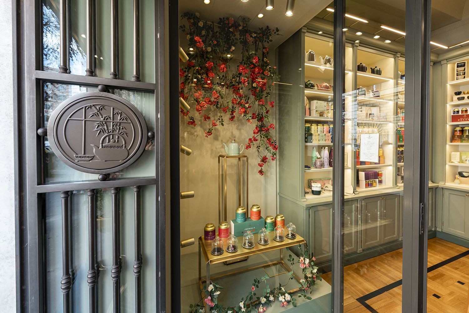 La prima boutique romana, in via Cola di Rienzo, nel cuore del quartiere Prati. Il negozio è un piccolo gioiello, caldo e accogliente, grazie agli elementi iconici dei negozi La Via del Tè: il delicato arredamento in verde celadon e la carta da parati con il pattern della Camellia Sinensis, la pianta del tè.