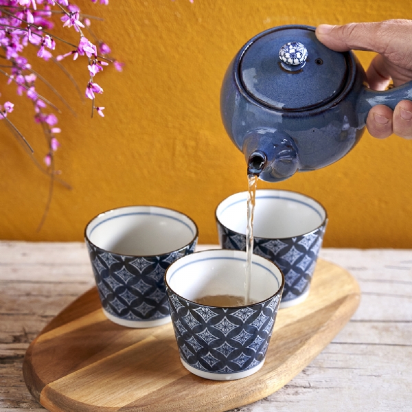 Un raffinato set giapponese di 5 tazze in porcellana con motivo geometrico. Il set è contenuto in una scatola regalo di legno.