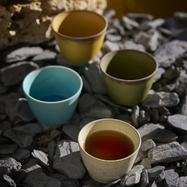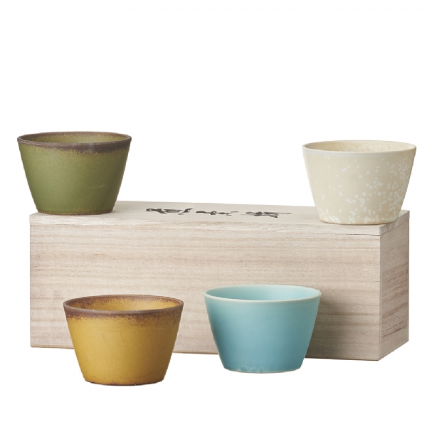 Semplicità e raffinatezza sono i tratti distintivi della ceramica giapponese tradizionale, che raggiunse l’apice circa 400 anni fa, con l’affermarsi della cerimonia del tè. Questo set con le quattro tazze in colori diversi è realizzato in ceramica leggera a testimonianza della bravura del maestro artigiano.